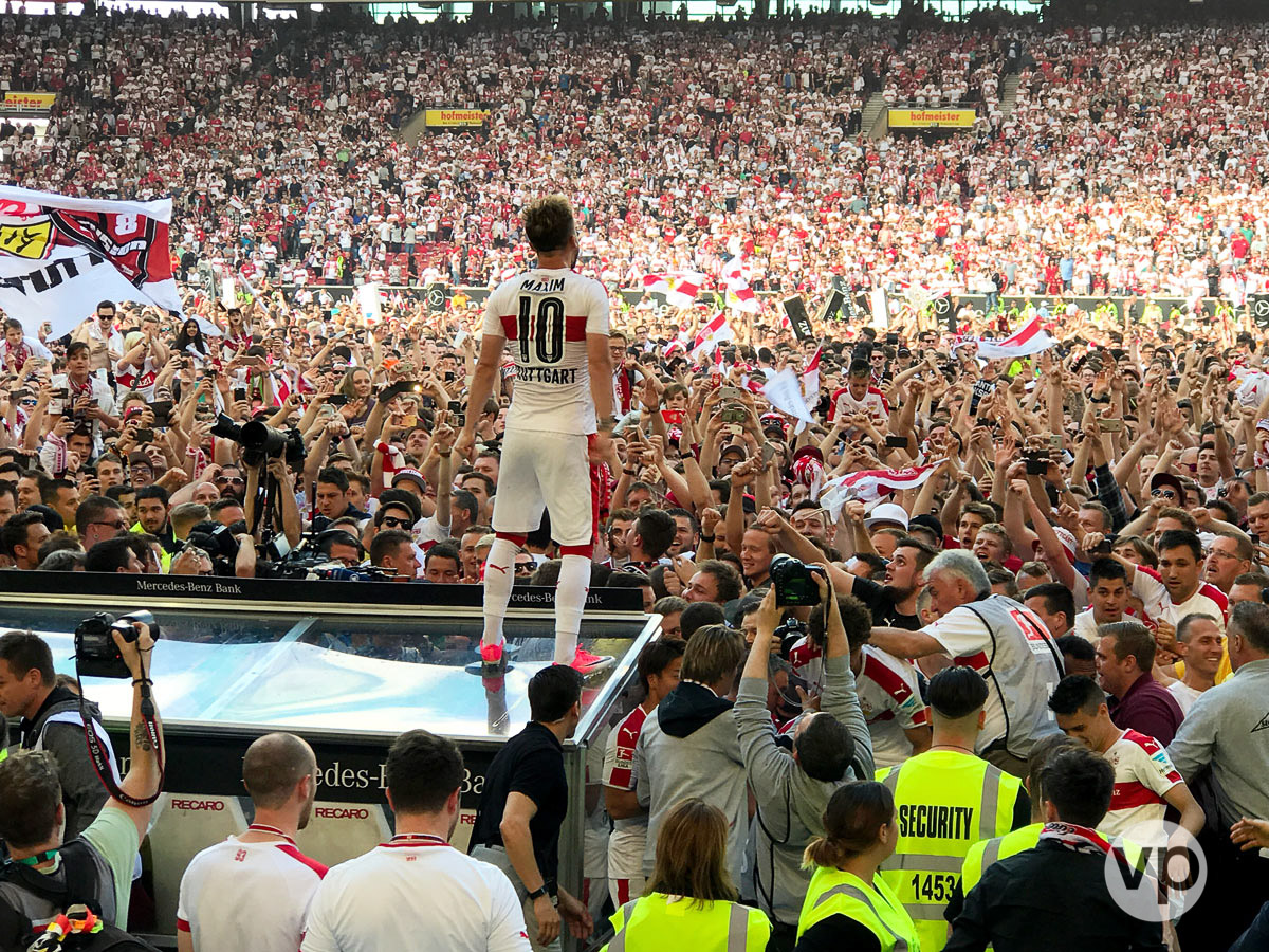 Aber eine Woche später ist das alles egal. Stuttgart macht mit einem Sieg gegen Absteiger Würzburg alles klar. Schlusspfiff, Platzsturm, Wasensause und ein episches Maxim-Foto, das es in viele Wohnzimmer und sogar auf eine Wade schafft.