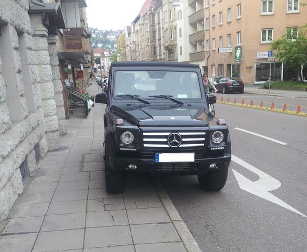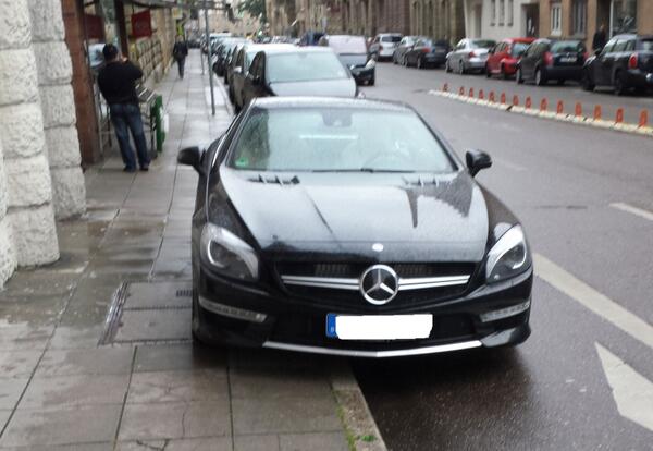 So hat z.B. Kevin Großkreutz die Sperrfläche in der Kurve adoptiert. Zuerst noch mit seinem R8 mit Dortmunder Kennzeichen, dann standesgemäßen mit einem Auto mit Stern, das für mich aussieht wie ein Walbaby. Ich dachte, er hätte den Audi verkauft, aber das ist wohl jetzt sein Zweitwagen, wie ein Bild aus dem August zeigt.