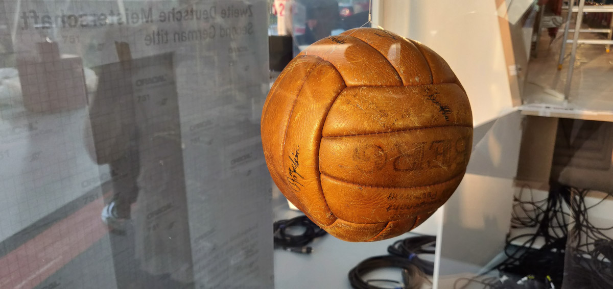Natürlich stehen die großen Erfolge im Vordergrund. Stellvertretend für alle Meisterschaften steht ein Mercedes aus dem jeweiligen Autokorso im Halbrund angeordnet – damit man nicht ganz vergisst, dass man sich in einem Automuseum befindet. Herzstück sind die genau elf Meter Geschichte von 1893 bis 2018. Seit Dr. Florian Gauß die Stelle als Archivar übernommen hat, wurden viele wunderbare Stücke VfB Historie gesammelt und einige davon sind hier zu sehen. Die Auswahl der Exponate war natürlich sehr schwer wie Gauß und Thomas Schwarz uns berichteten, auch weil im Gegensatz zu den Autos die Fußballaustellungsstücke viel kleiner sind und natürlich anders wirken.