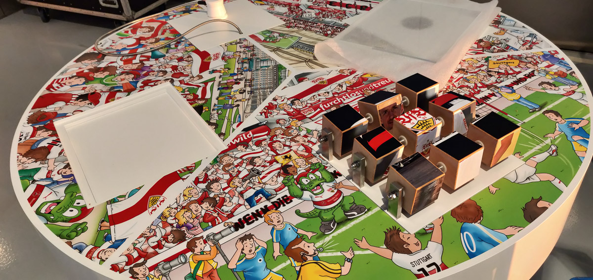 Was wäre eine aktuelle Ausstellung ohne große Videofläche mit einer Multimediavorführung? Es werden einige Videos abgespielt, die man stilecht von den roten Stadion-Schalensitzen aus genießen kann. Wir konnten in einer Sneak Preview einen kurzen Ausschnitt sehen, wie Robert Schlienz und Thomas Hitzlsperger im Wechsel unseren VfB zu den Meisterschaften in den 50er und 2007 führten. Emotionen und Gänsehaut sind Roten versprochen. Und ich befürchte, wenn ich mir das nochmal am Stück anschauen werde, wird auch eine Träne fließen. Und jeder, der sich schon einmal mit der Meisterschale oder dem DFB-Pokal fotografieren wollte – auch dazu gibt es die Möglichkeit.