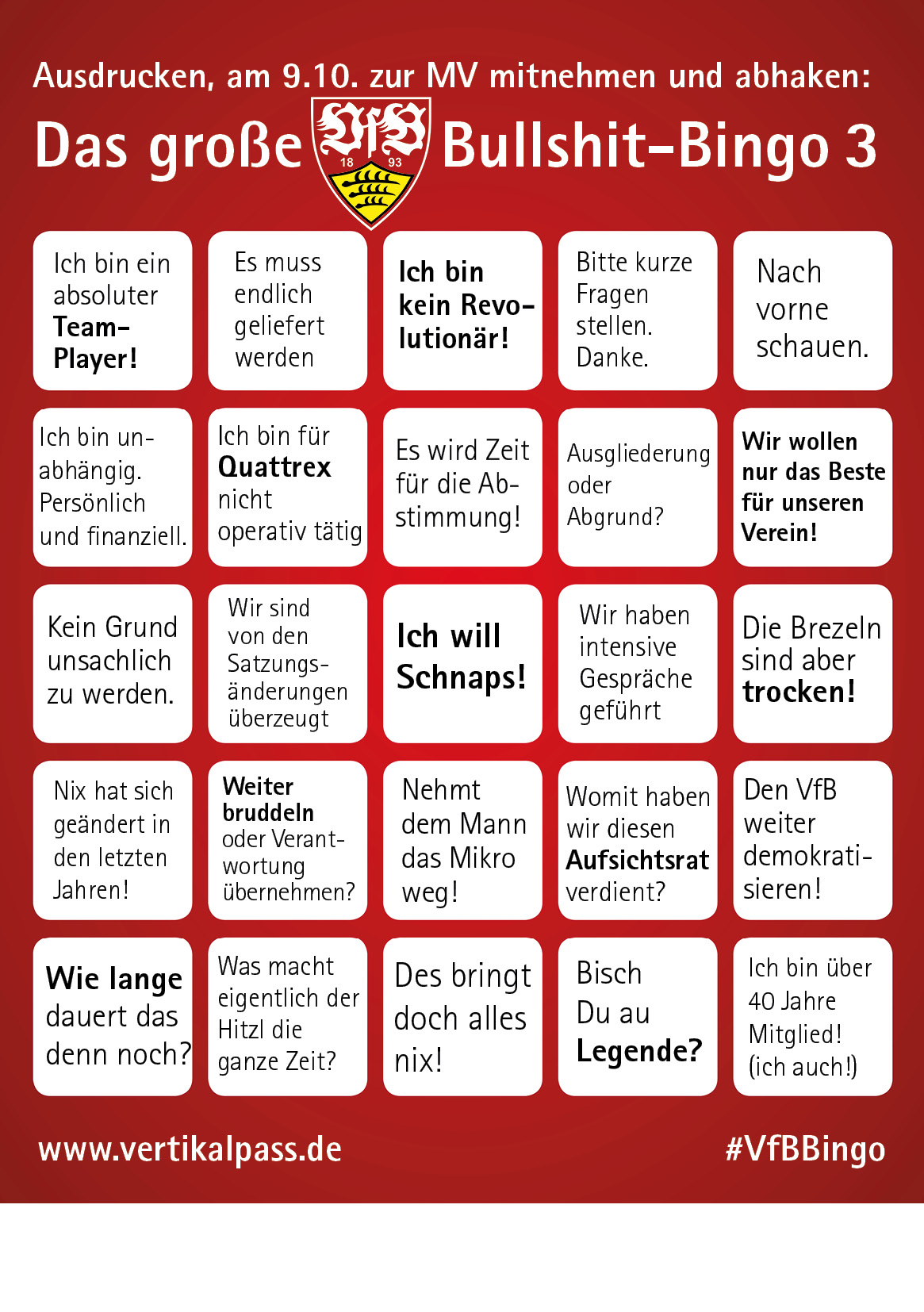 Um die Veranstaltung ein wenig kurzweiliger zu machen, empfehlen wir unser VfB-MV-Bullshit-Bingo. Sogar in drei Versionen für noch längeren Spielspaß. Einfach ausdrucken und mit in die Schleyerhalle nehmen. Wer alle Begriffe gehört und durchgestrichen hat, steht bitte unverzüglich auf und ruft: „Fritzle for President!“